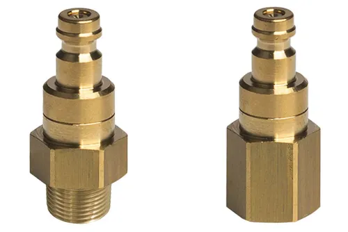 • rýchlospojky jednostranne uzatváracie, štandardne s ventilom zabudovaným do zásuvky, ventil sa otvára vložením zástrčky, zástrčka nemá ventil;