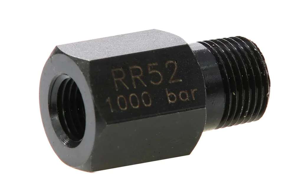 Adaptér redukčný s vonkajším závitom a vnútorným závitom umožňujúci spojenie rýchlospojok a hadíc UHP medzi sebou, ako aj pripojenie k pripojovacím blokom UHP. Materiál: uhlíková oceľ, čierne pozinkovaná. Pracovný tlak: 700 bar (pri bezpečnostnom faktore 4), 1000 bar (pri bezpečnostnom faktore 2,8).