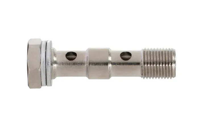 Dvojitá skrutka BANJO s podložkou typ D8 pre spojky typ R13, R14, D12, D17, D5, D6. Materiál: poniklovaná mosadz. Pracovný tlak: 18 barov.
