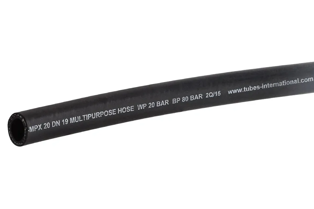 Univerzálny, silný a veľmi flexibilný gumový tlakový hadicový, určený na vzduch, vodu a ľahké chemikálie. Môže byť použitý na disperzné vodné epoxidové a polyuretánové farby. Nie je vhodný na oleje, palivá, aromatické uhľovodíky, celulózové farby, chlorokaučukové a iné obsahujúce aromatické rozpúšťadlá (napr. toluén, xylén) alebo benzín. Pri výbere pre chemické aplikácie odporúčame kontaktovať Tubes International. Vnútorná a vonkajšia vrstva antistatické (R<109 Ω/m), vonkajšia vrstva odolná voči ozónu, starnutiu a poveternostným podmienkam. Vnútorná vrstva: čierna guma EPDM. Výstuž: textilný oplet. Vonkajšia vrstva: čierna guma EPDM. Pracovný tlak: 20 bar. Pracovná teplota: od -40°C do +100°C (krátkodobo +120°C).
