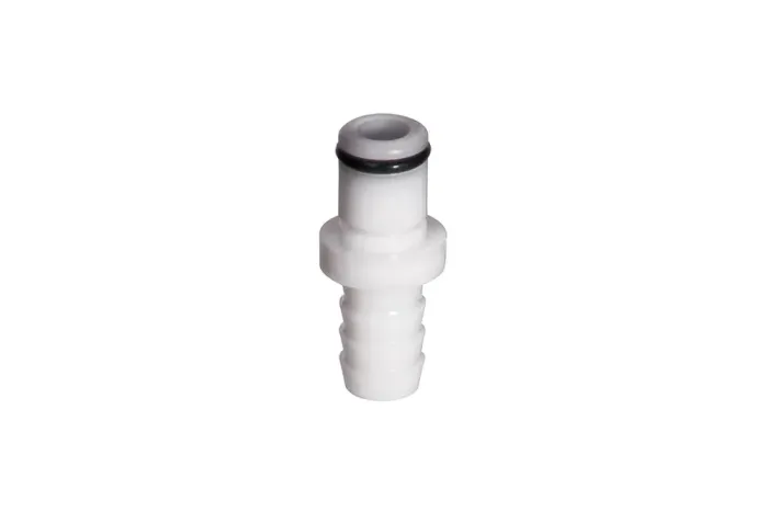 Stredne veľký konektor rýchlospojky bez ventilu s koncovkou na hadicu určený pre umývacie inštalácie, filtráciu deionizovanej vody, priemyselné automaty, detekciu únikov, atď. Dĺžka L [mm] – celková dĺžka. Materiál: acetal. Tesnenie: o-krúžok z NBR. Pracovný tlak: do 8,3 bar. Pracovná teplota: od -40°C do +82°C.