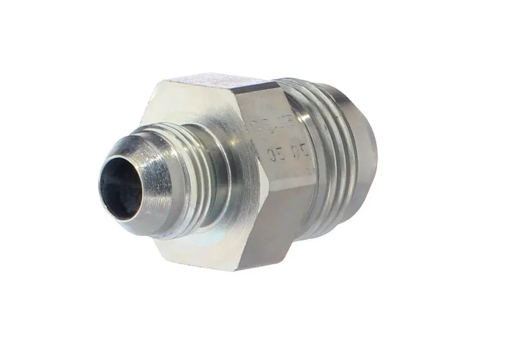 Priama redukčná spojka JIC 37° s vonkajším závitom UNF (tesnenie na kuželi 37°). Materiál: uhlíková oceľ, pozinkovaná.