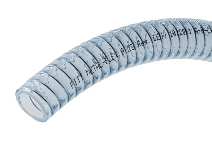 Univerzálny, ľahký, veľmi flexibilný sací a výtlačný hadicový systém, určený pre všeobecné priemyselné aplikácie na vodu a ľahké chemikálie, iné kvapaliny (bez tuku, olejov a uhľovodíkov). Môže byť použitý aj na vzduch, vákuový prenos prachu a práškov – v takom prípade je potrebné zohľadniť oderuvzdornosť a prípadný problém so statickou elektrinou. Môže byť použitý (pri teplotách do +40°C) na tekuté a polotekuté potravinárske produkty ako sú šťavy, nápoje, pivo, víno, alkoholy s koncentráciou do 50%, mlieko a jeho výrobky. Nie je odporúčaný na oleje a mastné potravinárske látky. Spevnenie špirálou z oceľového drôtu, zapustenou v stene z mäkkého PVC, poskytuje dobrú odolnosť voči podtlaku a prehýbaniu hadice. Priehľadná stena umožňuje jednoduchú vizuálnu kontrolu prietoku. Ako hadica spevnená iba oceľovou špirálou (bez opletu) sa vyznačuje určitým predĺžením pod tlakom, čo je potrebné zohľadniť pri použití, najmä pri zvýšených teplotách. Hadica METALFLEX PVC je v súlade s európskymi požiadavkami 1935/2004/EC, 10/2011/EU (simulanty A, B, C a D1), 2023/2006/EC (GMP) a FDA CFR 21 175.300 a 175.1210. Je vhodná na dočasný kontakt s potravinami pri prenose potravinárskych látok – za podmienok stanovených v deklarácii zhody výrobcu (dostupná v Tubes International). Materiál hadice: priehľadný, mäkký PVC. Spevnenie: pozinkovaná oceľová špirála. Pracovný tlak pre teplotu 20°C: od 1 bar do 9 bar – v závislosti od priemeru hadice. S rastúcou teplotou prevádzky sa znižuje hodnota pracovného tlaku hadice. Prevádzková teplota: od -10°C do +65°C.