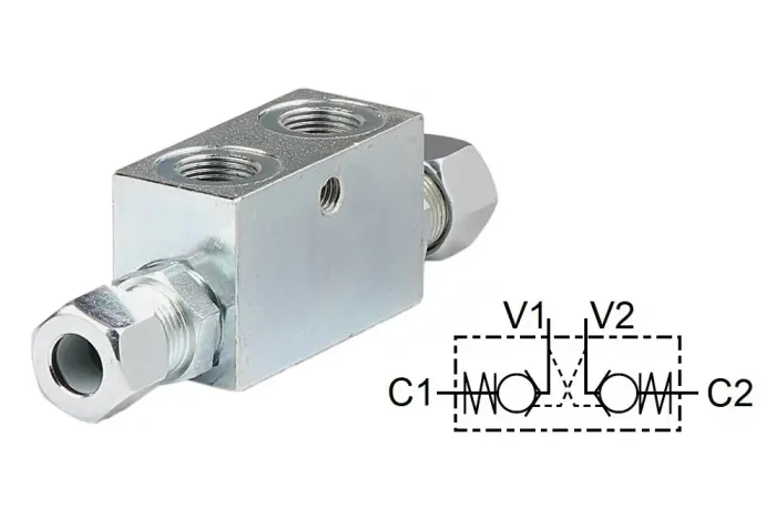 Spätný ventil (hydraulický zámok) typu VRDE sa používa v hydraulických systémoch ako ochranný prvok proti samovoľnému pohybu dvojčinného valca (zasunutie / vysunutie piestnice). Prípojky C1, C2 (zo strany valca) sú vybavené zarezávacími krúžkami a maticami podľa DIN 2353. Povolený smer prúdenia: V1 → C1 (a súčasne C2 → V2), V2 → C2 (a súčasne C1 → V1). Ventil je vybavený montážnym otvorom. Materiál: pozinkovaná oceľ (telo), tvrdená oceľ (čap). Tesnenie: NBR. Otvárací tlak: 3 bar. Prevádzková teplota: od -20°C do +100°C.