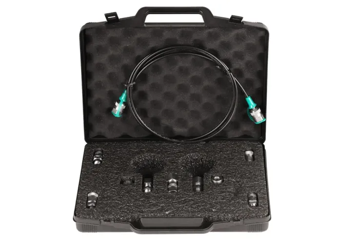 Merací súbor je určený na diagnostiku hydraulických a pneumatických inštalácií prostredníctvom merania statického, dynamického tlaku a vákua. Súbor obsahuje plastový kufrík s pripravenými miestami na dva manometre 63 mm, hadicu DN2 (630 bar) s dvoma meracími koncovkami GW M16x2 s dĺžkou 2000 mm a spojky a adaptéry: 1. Meracia spojka M16x2 s kovovou zátkou, s GZ 1/4” BSP, typ E – 2 ks. 2. Meracia spojka M16x2 s kovovou zátkou, s GZ M8x1, typ F – 1 ks. 3. Meracia spojka M16x2 s kovovou zátkou, s GZ M10x1, typ F – 1 ks. 4. Prípojka s GW 1/4” BSP k manometru, priechodná, s GZ M16x2 – 2 ks. 5. Prípojka s GW 1/4” BSP k manometru, s GW M16x2 – 1 ks. 6. Redukčný adaptér GZ 3/8” BSP / GW M10x1, typ E – 1 ks. 7. Redukčný adaptér GZ 1/2” BSP / GW M10x1, typ E – 1 ks. Súbor neobsahuje manometre, ktoré je potrebné vybrať a objednať samostatne. Materiál spojok: oceľ s povlakom zinku a niklu. Tesnenie: NBR. Pracovný tlak: do 630 bar.