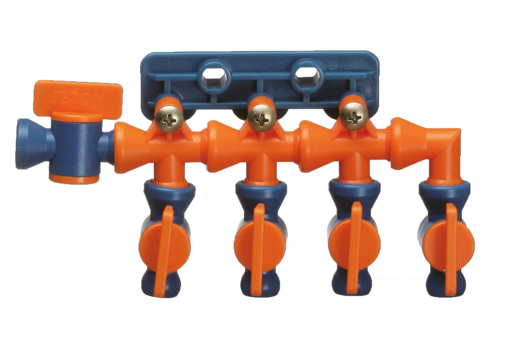 Systém rozdeľovania s reguláciou prietoku na odvádzanie chladiacej kvapaliny – systém 1/4″. Súčasti: držiak – 1 ks, koleno – 1 ks, trojcestný spoj – 3 ks, spojovací ventil – 4 ks a upevňovacie skrutky – 3 ks. Materiál: acetal. Prevádzkový tlak: do 3 bar. Prevádzková teplota: do +65°C.