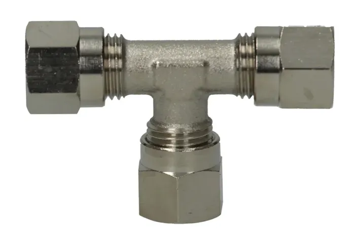 Skrutkovaný trojník „T“, typ B9, s rezacím krúžkom určený na spájanie medených rúr a plastových hadíc. Pri spájaní s hadicami sa odporúča použitie vystužovacích puzdier (B12). Materiál: poniklovaná mosadz. Prevádzkový tlak: 60 barov.