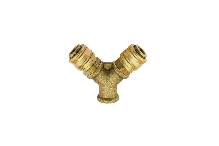 Rozdvojka „Y“ s vnútorným závitom BSP a s rýchlospojkami Eurostandard DN7,2 na použitie v priemyselných inštaláciách, napr. na vzduch. Materiál: mosadz. Pracovný tlak: do 35 bar. Pracovná teplota: do +100°C.