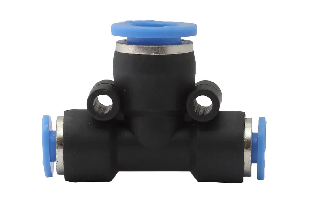 Redukčný trojcestný spoj „T“ so zásuvnými spojkami pre hadicu s metrickým priemerom, séria S, typ PUTM. Ekonomické riešenie na spájanie flexibilných pneumatických hadíc s metrickým kalibrovaným vonkajším priemerom. Jednoduché a rýchle použitie. Materiál: plast. Pracovný tlak: 10 bar. Podtlak: 0,99 bar. Pracovná teplota: od 0°C do +60°C.