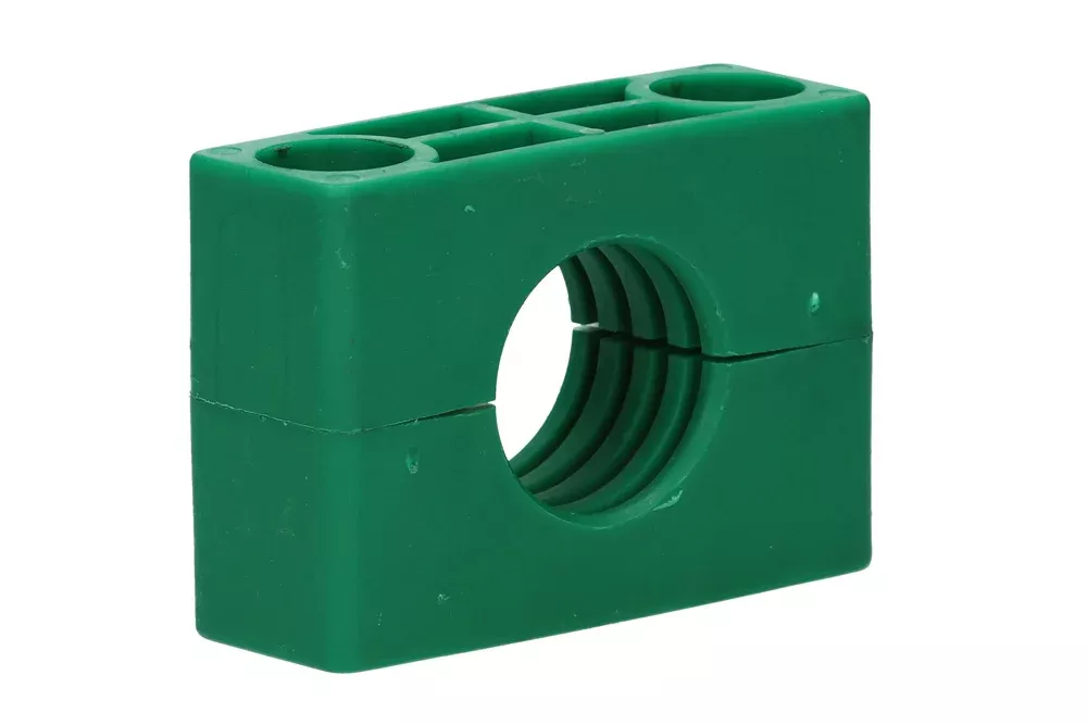 Dvojdielna vložka objímky DIN 3015 typu 201 vyrobená v súlade s normou DIN 3015. Štandardne má profilovaný (drážkovaný) povrch otvoru na rúrku. Materiál vložky: zelený polypropylén. Pracovná teplota: od -30°C do +90°C.