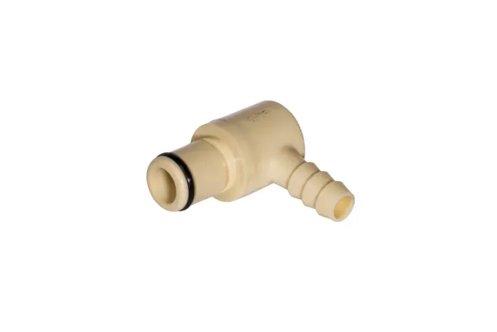 Stredne veľký konektor 90° rýchlospojky bez ventilu s koncovkou na hadicu určený pre umývacie inštalácie, filtráciu deionizovanej vody, priemyselné automaty, detekciu únikov, atď. Dĺžka L [mm] – celková dĺžka. Materiál: polypropylén. Tesnenie: o-krúžok EPDM. Pracovný tlak: do 8,3 bar. Pracovná teplota: od 0°C do +71°C.