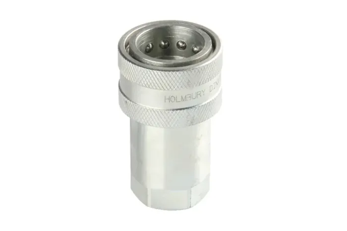 Zásuvka rýchlospojky DIN typ V s ventilom hubkového typu a vnútorným závitom BSP. Používa sa hlavne v poľnohospodárskych strojoch. Rýchlospojka o veľkosti 1/2″ je kompatibilná s rýchlospojkou v štandarde ISO-A index HQ-IA12-F-08G. Materiál: pozinkovaná oceľ. Pracovná teplota: od -25°C do +100°C. Tesnenie: NBR. Pracovný tlak: do 375 bar (v závislosti od veľkosti rýchlospojky). Priepustnosť bola uvedená pre pokles tlaku 3 bary.